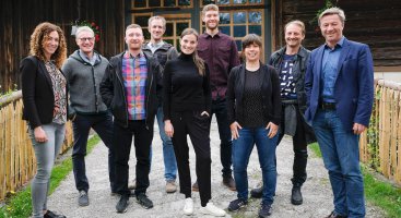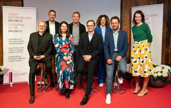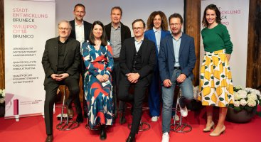 v.l.n.r: Prof. Dr. Roland Benedikter – EURAC Research, Thomas Mur – Messe Bozen, Christian Tschurtschenthaler – Stadtentwicklung Bruneck, Jana Schmidhammer – Schmidhammer GmbH, Marion Niederkofler – Stadtentwicklung Bruneck, Hannes Berger – Dr. Schär AG, Roland Griessmair – Bürgermeister, Patrizia Hainz - Moderatorin